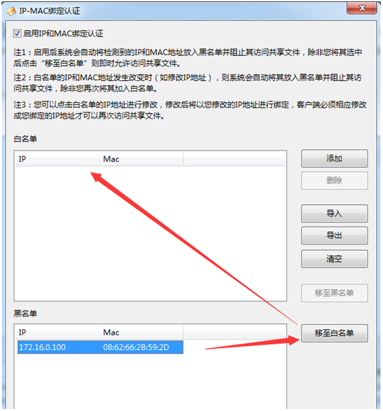 此項功能主要用來對用戶訪問共享文件時進行IP和MAC綁定認證,也就是只有加入綁定表內,且符合綁定規則的用戶才可以正常訪問共享文件,否則將予以拒絕。例如,沒有加入綁定表內的外來用戶將直接拒絕訪問共享文件,或者綁定表內的電腦如果修改IP地址和MAC地址將會直接拒絕訪問共享文件。如下圖所示: