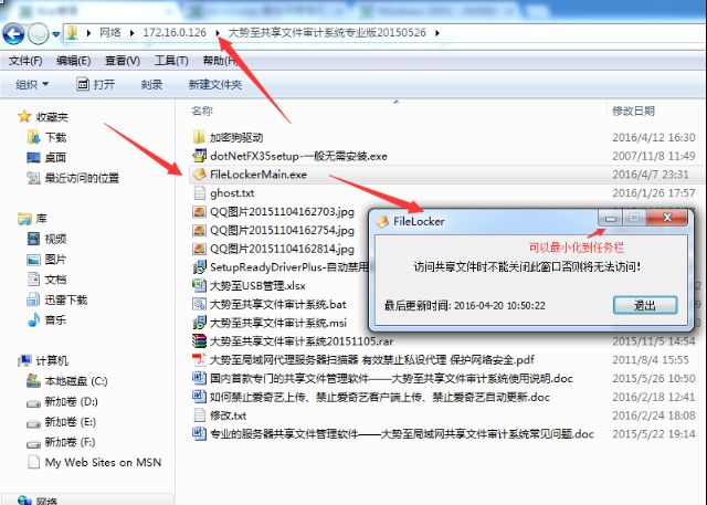 2、禁止復制文件內容、禁止另存為、禁止打印三項功能生效,需要客戶端在訪問共享文件時運行相關的客戶端軟件FileLockerMain.exe,如果不運行將直接阻止其訪問對應的共享文件。如果其運行后關閉客戶端軟件,則即時中斷共享文件的訪問。如下圖所示: