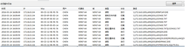 同時,系統還會形成詳細的共享文件訪問日志,記錄訪問者的IP地址、MAC地址、主機名、域賬號、訪問時間、訪問文件和訪問動作以及系統對其訪問的攔截或放行情況,如下圖所示:
