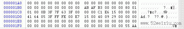 MBR,即主引導(dǎo)紀(jì)錄,位于整個(gè)硬盤(pán)的0柱面0磁道1扇區(qū),共占用了63個(gè)扇區(qū),但實(shí)際只使用了1個(gè)扇區(qū)(512字節(jié))。在總共512字節(jié)的主引導(dǎo)記錄中,MBR又可分為三部分:第一部分:引導(dǎo)代碼,占用了446個(gè)字節(jié);第二部分:分區(qū)表,占用了64字節(jié);第三部分:55AA,結(jié)束標(biāo)志,占用了兩個(gè)字節(jié)。后面我們要說(shuō)的用winhex軟件來(lái)恢復(fù)誤分區(qū),主要就是恢復(fù)第二部分:分區(qū)表。