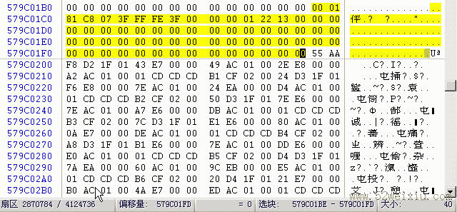這個(gè)就是D盤(pán)的EBR,也就是D盤(pán)的分區(qū)表了,怎么知道的呢?因?yàn)镸BR和EBR的結(jié)構(gòu)是完全一樣的,都是占用了63個(gè)扇區(qū),但只用了第一個(gè)扇區(qū),其余62個(gè)扇區(qū)填零不用。第一個(gè)扇區(qū)前446個(gè)字節(jié)都為引導(dǎo)代碼,后64個(gè)字節(jié)為分區(qū)表,最后2個(gè)字節(jié)為55AA結(jié)束標(biāo)志。因?yàn)镋BR不是活動(dòng)分區(qū),不需要引導(dǎo)代碼,所以前446個(gè)字節(jié)為零。