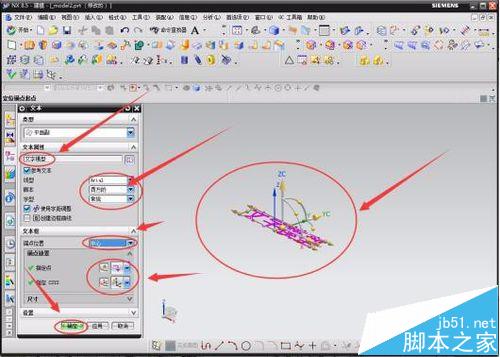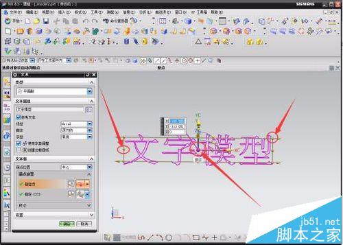 5 、選中單擊文本后,就需要確立一個二維的文字樣式。點擊后,鼠標上會有一個文字樣式,選擇合適的位置點擊確定。文字默認為“Text”,點擊“參考文本”前面的小方格,去掉勾號(去掉勾號,才能編寫文字)。編寫文字,如輸入“文字模型”,再在“參考文本”前面的小方格里打上勾,錨點位置選擇“中心”,選擇好方向(一般默認的都可以),最后點擊“確定”即可。一個二維的文字模型就會呈現出來。