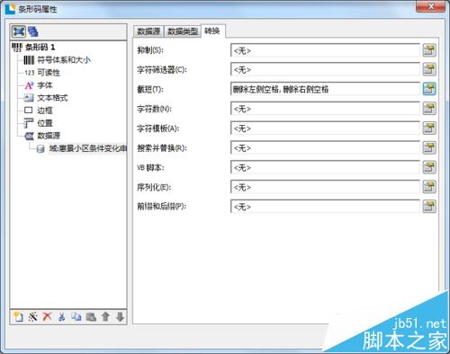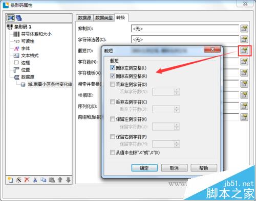 2、將屬性對話框數(shù)據(jù)源選項切換到“轉(zhuǎn)換”界面,單擊“截短”右側(cè)按鈕,在彈出的對話框中勾選“刪除左側(cè)空格”及“刪除右側(cè)空格”,單擊確定。
