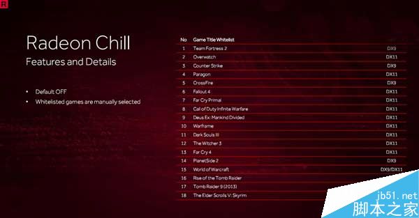新功能方面主打Radeon Chill,來自于AMD收購的HiAlgo三大技術之一,一款高效幀率控制器,可根據鼠標移動速度動態(tài)調節(jié)顯卡幀率,旨在降低系統(tǒng)功耗,同時讓最終用戶持續(xù)獲得最佳游戲體驗,實現(xiàn)平滑游戲而不會對性能產生顯著影響,為用戶帶來更涼爽更安靜系統(tǒng)。