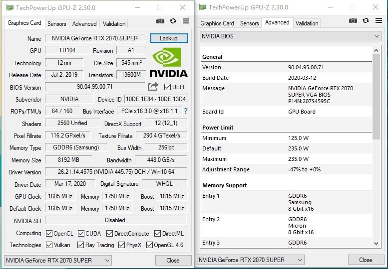 以上為GPU-Z的截圖。RTX 2070 SUPER冰龍超級(jí)版擁有2560個(gè)流處理器,64個(gè)ROP單元和160個(gè)紋理單元,顯存容量8GB,顯存頻率14GHz,帶寬448GB/s。