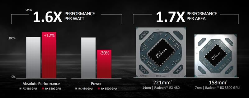 RX 5500 XT采用了7nm制程工藝,在性能比RX 480提升12%的前提下,功耗降低了30%(其實(shí)根據(jù)實(shí)測遠(yuǎn)遠(yuǎn)不止30%),GPU核心面積則從221mm2降低到了158mm2,也就是說相同的核心面積下,性能可以獲得70%的提升。