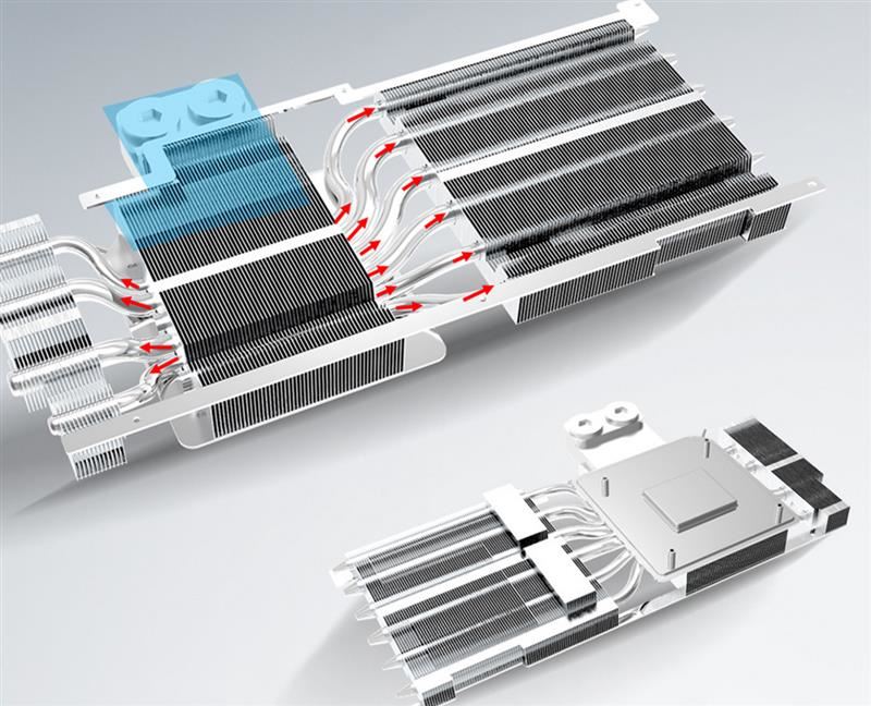 影馳RTX 2080 Ti HOF十周年紀念版的獨到之處是采用了風冷+分體水冷的白鯨混合散熱系統。3條8mm+3條6mm一共6條復合熱管已經可以將300W的RTX 2080 Ti HOF十周年紀念版壓制在67度之內,如果接上分體水冷與風冷一起共同工作,這塊顯卡將會擁有不可思議的低溫表現。