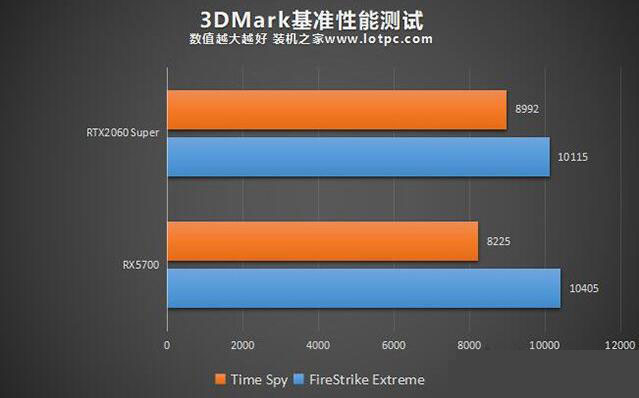 在3DMark理論測試環節中,RX5700在Time Spy項目中獲得了8225分,而RTX2060Super獲得了8992分,而在FireStrike Extreme項目中,RX5700獲得了10405分,而RTX2060Super獲得了10115分,互有勝負,RX5700在DX11中更有優勢,而RTX2060Super在DX12中更有優勢。