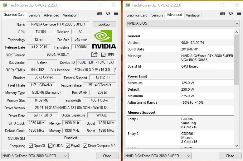 RTX 2080 Super大將的Boost頻率比公版高了15Mhz,其他所有規格參數都與公版完全等同,包括250W的TDP。