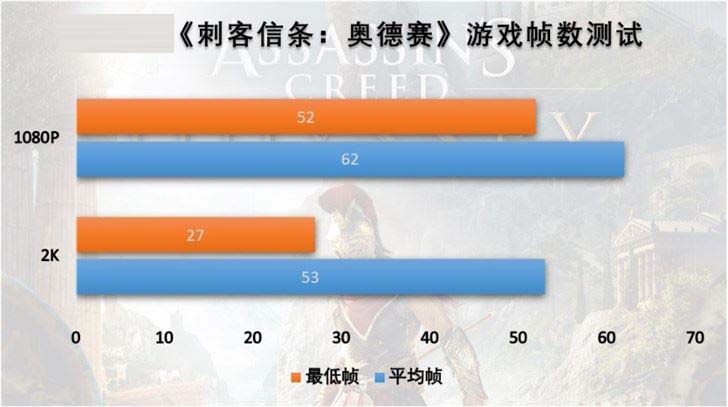最后看一下顯卡壓力較大的《刺客信條:奧德賽》,分別在1080P以及2K分辨率下運行游戲內置基準測試,得到平均幀數和最低幀數,最低幀數與實際游戲中有較大誤差,不具備太多參考價值,結果如下: