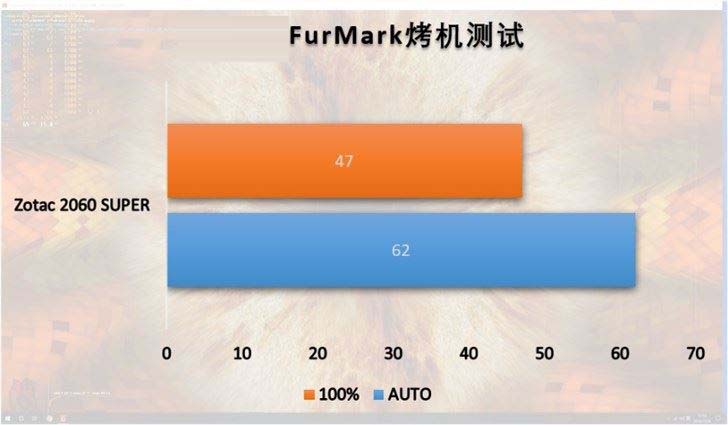 風扇策略默認時,烤機溫度穩定在62℃,表現尚可;將風扇轉速手動拉滿后,溫度會降至47℃,降溫效果十分明顯,拉高轉速難免會帶來一些噪聲的提高,但我們測試的這張非公RTX 2060 SUPER顯卡在手動拉滿風扇轉速后,噪聲并沒有提升到“惱人”的程度,開放機箱下聲量水平依然可以接受,放進封閉機箱后幾乎不會帶來更多的打擾。