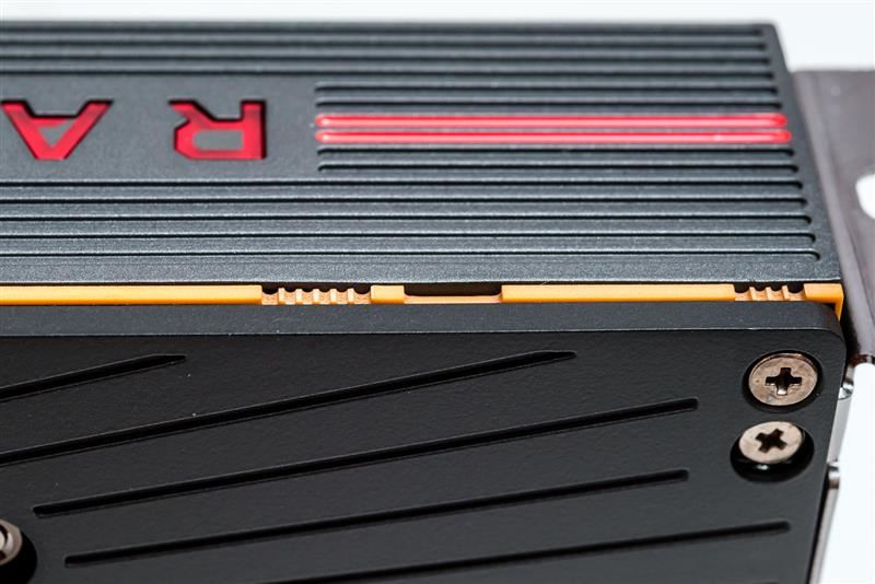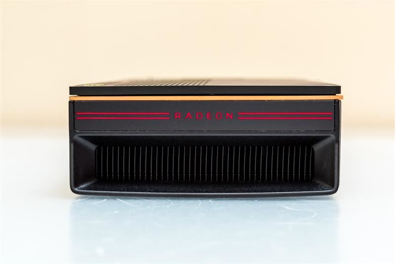 顯卡正面為金屬材質,與過去的AMD公版卡相比,這次在風扇后面做了一個收腰處理。