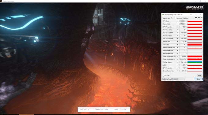 在firestrike循環20分鐘后,我們可以從GPUZ的讀數中看到,索泰RTX 2080 Ti PGF OC14的核心溫度一直保持在70度附近,而核心頻率在1890~1905MHz之間浮動,這一浮動涉及英偉達功耗墻問題,如果打算在跑分軟件中拿到更好成績,建議解鎖功耗再跑。