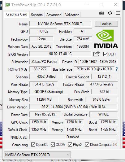 在GPUZ基本信息里,我們可以看到索泰 RTX 2080 Ti PGF OC14的核心boost頻率為1755MHz,相對于公版FE的1635MHz有了較大提升,而顯存部分是1750MHz,和公版FE一致,不同于早年首發的鎂光閃存,索泰的這塊PGF OC14使用三星GDDR6。