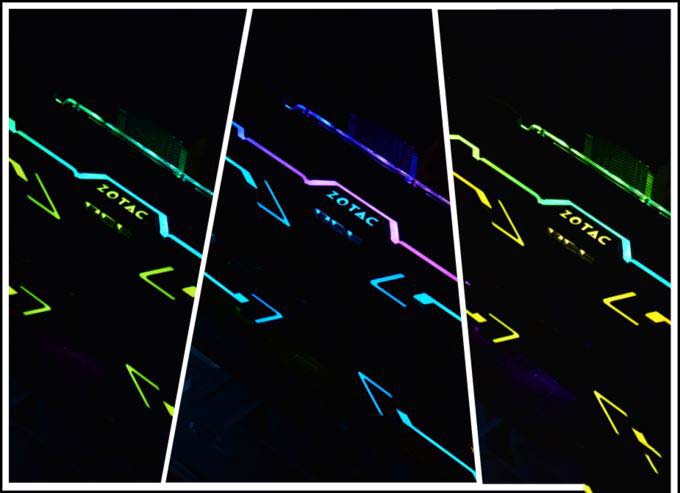 在燈效方面,索泰 RTX 2080 Ti PGF OC14最主要改變是引入可尋址RGB,也就是ARGB燈效,適合玩燈愛好者自己定制燈光效果,不過燈光這種東西嘛還是看圖來得實際~