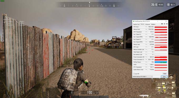 在PUBG的訓練場場景下,全超高畫質負載15分鐘后,顯卡溫度和之前生化危機2重制一樣,核心頻率1905MHz,溫度一直保持在67度,風扇轉速相對更低一些在1200~1300RPM,此時GPUZ功耗讀數為260W。