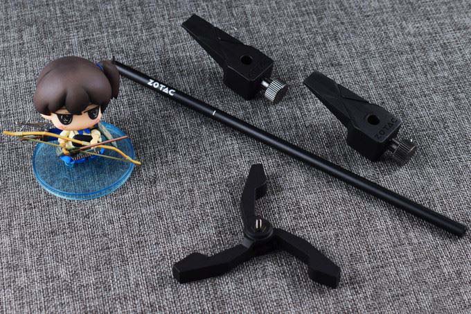 作為一款旗艦顯卡,索泰 RTX 2080 Ti PGF OC14的附件是相當豪華的,除了基本的箱說和外接供電線外,還附贈了顯卡支撐架和無燈背板,前者滿足超長顯卡的支撐需求,而后者則可以為拒絕光污染的玩家所用,可以說相當體貼了。