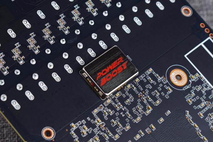 OC14在顯卡背面也使用了Power Boost技術來提升顯卡穩定,Power Boost本身利用去高端耦電容減少干擾,提高核心供電純凈度。