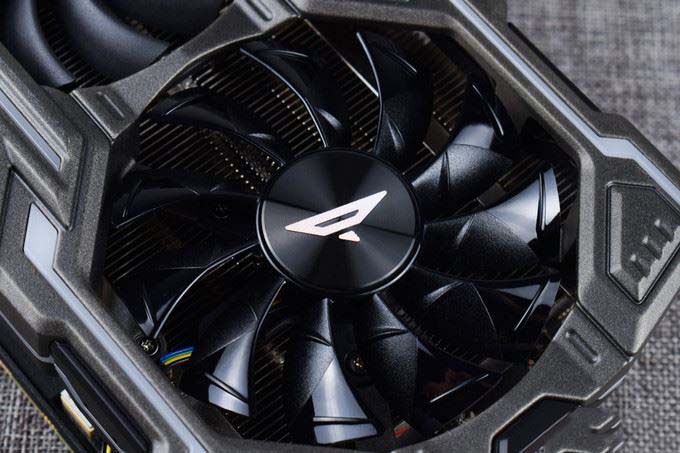 在散熱風扇部分,索泰 RTX 2080 Ti PGF OC14的風扇使用了獨立控速設計,通過三風扇不同轉速的調整提升散熱效率,而扇葉方面,OC14在左右兩把風扇上使用了特定傾斜角度的鯊魚盾鱗仿真扇葉設計,規格為11葉的9CM風扇,在風壓和風量上都有保證。