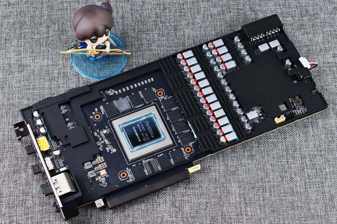 在細節方面,NVLINK自然是為多卡需求的土豪而設,雙8PIN供電接口也做了反向安裝設計,方便外接電源線拆裝,在顯卡核心背面電容也做了用料增強,細節方面還是挺到位的。
