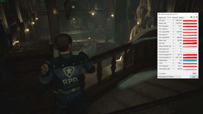 在生化危機2重置版的此處場景中,顯卡核心溫度一直穩定在67~70度,核心頻率一直穩在1905MHz,顯卡風扇轉速也在1K3~1K4,GPUZ功耗讀數比3Dmark低,僅為230~250W之間,溫度表現理想,且風扇轉速較低,主機放在腳下的話會相當安靜。