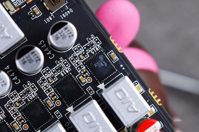 值得注意的是,索泰 RTX 2080 Ti PGF OC14在輸出接口的低通電路部分用料也是相當可以,屏蔽罩,電容一個沒少,而PCB顯存上方則有電壓點檢測點,方便極限超頻的玩家調試。