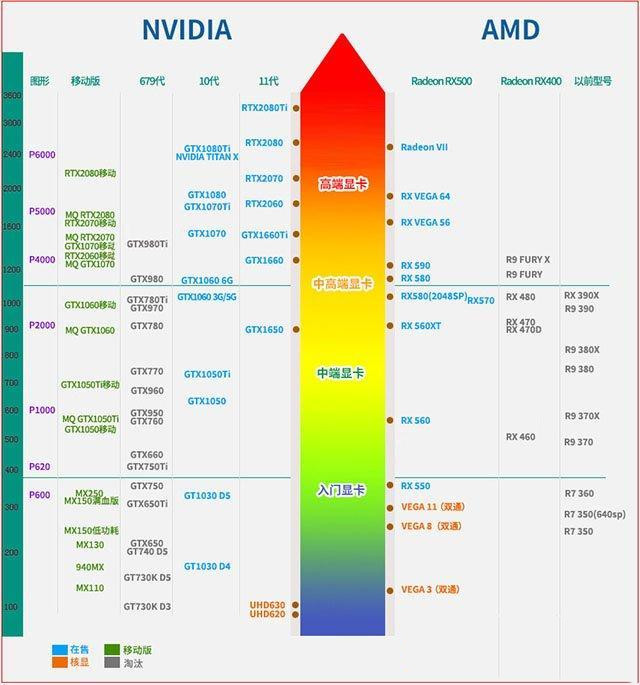 顯卡天梯精簡版主要是目前最新一代和上一代的顯卡芯片,目前NVIDIA全新一代是16系、20系(支持光線追蹤和DLSS兩大技術),AMD全新一代是RX500系,其它老架構產品基本都淘汰停產了。