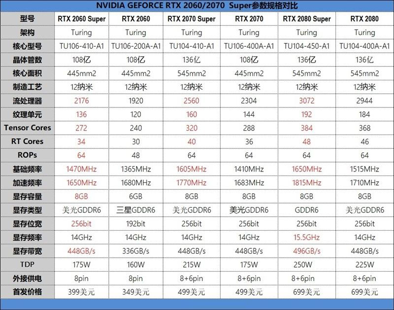 從上面的表單可以看出RTX 2060 Super的提升幅度最大,如果將RTX 2060就此拿掉,在RTX 2060 Super與GTX 1660 Ti之間就有有巨大的真空區存在,因此RTX 2060 Super上市之后,將會與RTX 2060共存。價格方面,RTX2060 Super定價為399美元,比RTX 2060貴了50美元。