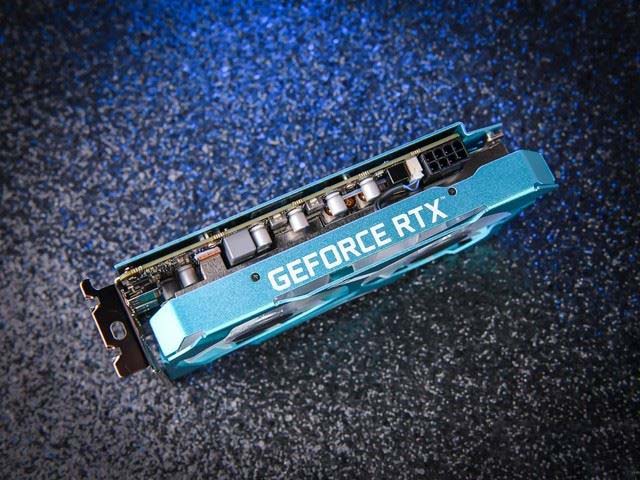 顯卡上方并沒有采用全包裹設計(估計也是為了散熱),側面印有“GEFORCE RTX”字樣。并且可以看到這塊顯卡采用了單8pin的額外供電接口設計。