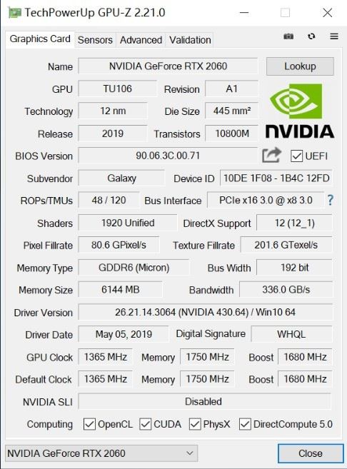我們首先來看一下GPU-Z的截圖,由于2060用的是同一款TU106-200芯片,因此參數方面我們不再贅述,只看加速頻率的話,這款顯卡為1680MHz,并沒有進行超頻(公版加速頻率即為1680MHz)??紤]到這款顯卡并不主打性能,這樣的操作可以理解。