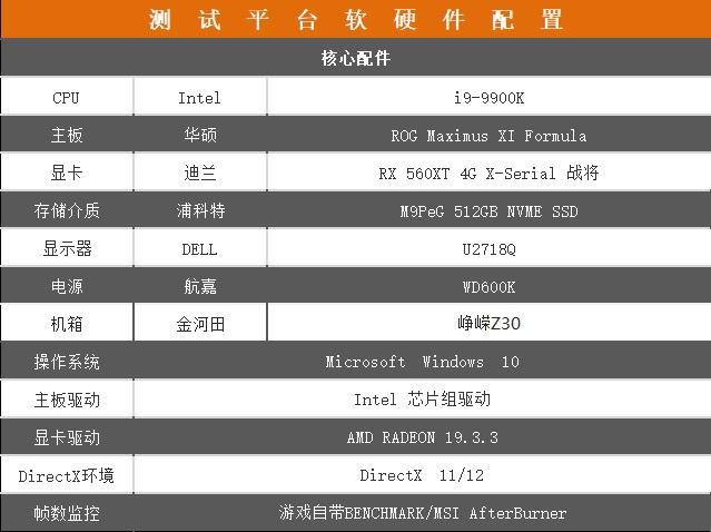 測試平臺方面,為了保證發(fā)揮出顯卡的最大實力,避免其他硬件帶來的瓶頸,CPU方面我們采用第九代Intel八核心十六線程的i9-9900K、ROG Maximus XI Formula、浦科特M9PeG 512GB NVME SSD、電源為航嘉WD600K、機箱為金河田崢嶸Z30。詳情請看上圖。