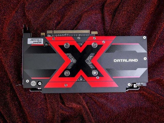 顯卡頂部也非常簡單,一個“X”型標志+DATALAND名稱,非常簡潔,從中間還能看到隱約漏出的散熱銅管。另外顯卡配置了一個8pin的額外供電。
