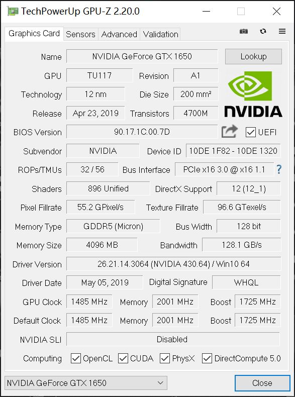 前面通過外包裝盒我們就已經(jīng)知道該卡是一張預(yù)超頻的OC版顯卡,通過GPU-Z,我們可以看到耕升GTX 1650炫光OC顯卡基礎(chǔ)頻率與公版方案一樣是1485MHz,Boost頻率相比公版方案高60MHz,公版方案是1665MHz,耕升GTX 1650炫光OC是1725MHz,顯存等效頻率為8Gbps。