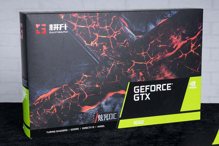 耕升GTX 1650炫光OC顯卡外包裝盒正面延續(xù)了其炫光系列的設(shè)計(jì),仍然是一個(gè)X型的熔巖裂紋圖案,正面底部有“炫光OC”字樣,說明這張卡是一張OC版的顯卡。