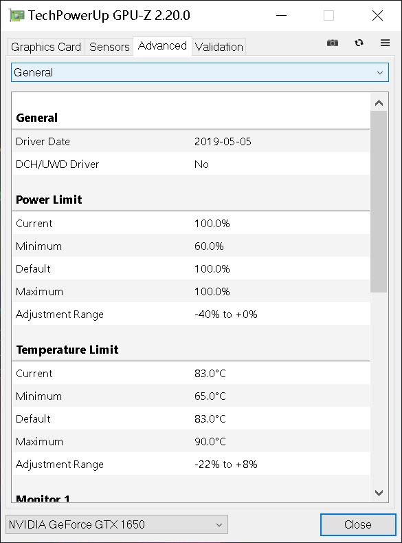 這里可以看到耕升GTX 1650炫光OC默認(rèn)溫度上限為83攝氏度,可以向上進(jìn)一步解鎖到90攝氏度。