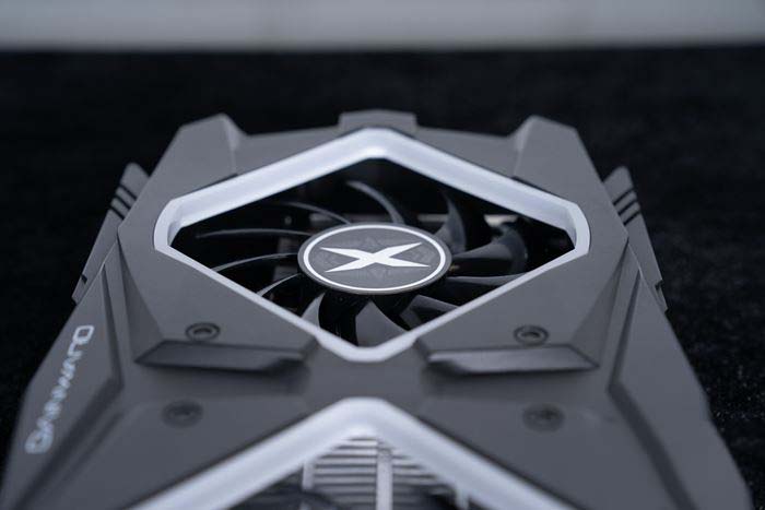 耕升GTX 1650炫光OC顯卡正面主要以黑色為基調(diào),還是突出沉穩(wěn)的感覺,風(fēng)扇位置的菱形設(shè)計(jì)很出挑,風(fēng)扇形成的圓形和這個(gè)方形相碰撞,方圓之間的設(shè)計(jì)頗有沖擊力,俗話也有說“方圓之間是人生智慧”。另外,耕升的logo在正面頂部的位置,從正面看,顯卡頂部像是展翼的樣子,耕升GTX 1650炫光OC的外觀整體來說還是很不錯(cuò)的。