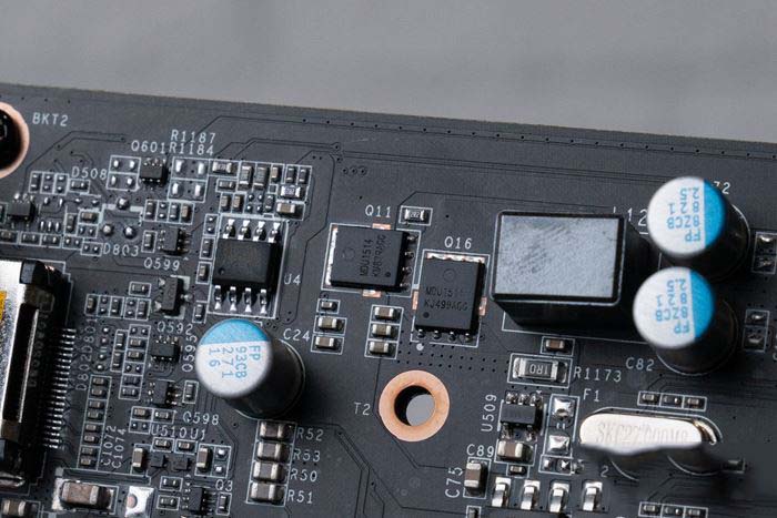 供電方面,由于TU117核心相當(dāng)省電,耕升GTX 1650炫光OC采用了2+1相供電,這也足夠了,其中2相給TU117核心供電,1相給顯存供電。