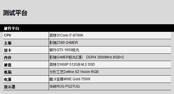 為了排除其他硬件的瓶頸,本次耕升GTX 1650炫光OC的性能評測采用了一套較為高端的平臺,具體是Intel Core i7-8700K處理器搭配影馳Z390 GAMER主板,內(nèi)存是雙通道的影馳GAMER極光幻影DDR4 3000MHz 8GB×2,開啟XMP讓內(nèi)存工作在3000MHz頻率,硬盤為英特爾600P 512GB M.2 SSD,其余硬件詳細(xì)如下: