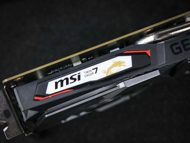 由于入門級定位的問題,顯卡并沒有背板,不過微星細心地將龍盾印在了顯卡的右側。而且大家可以發現散熱模組并沒有漏出PCB太多,這點給好評。