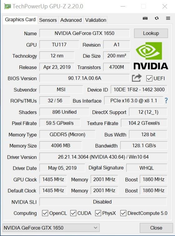 我們先來看一下GPU-Z中顯卡的詳細參數。微星 GTX 1650 GAMING X使用了基于圖靈架構打造的TU117核心,搭配4GB GDDR5顯存,顯存位寬128bit,帶寬128GB/s,加速頻率達到了1860MHz,相比其他家的顯卡高出了不少。