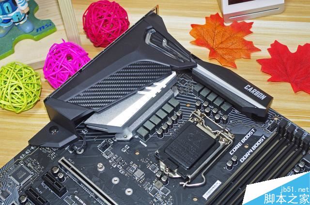 ▲CPU供電區(qū)域,采用6+2+1相供電,能夠滿足9900K、9700K這些CPU的供電,MOS部分都有用料扎實的鋁合金散熱片加以覆蓋。I/O覆蓋裝甲上有碳纖維花紋,頂部還有個RGB玻纖,可以做RGB變幻。