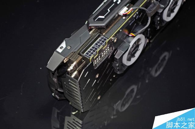 ▲在顯卡的末端還有出風(fēng)擋板,讓熱風(fēng)盡量從PCI插槽那邊流出。2*8pin外接供電接口反置,接線方便。