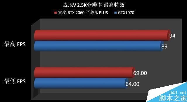 ▲測試匯總表格在這里哦,右邊欄是索泰RTX2060至尊版PLUS,左邊欄是GTX1070,其中GTX1070在戰(zhàn)地5開啟光追的話,會卡到懷疑人生,而且不能開啟DLSS,那么其他的對比的話 我們來看看柱形圖這個直觀的表現(xiàn)吧。