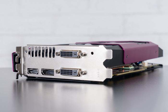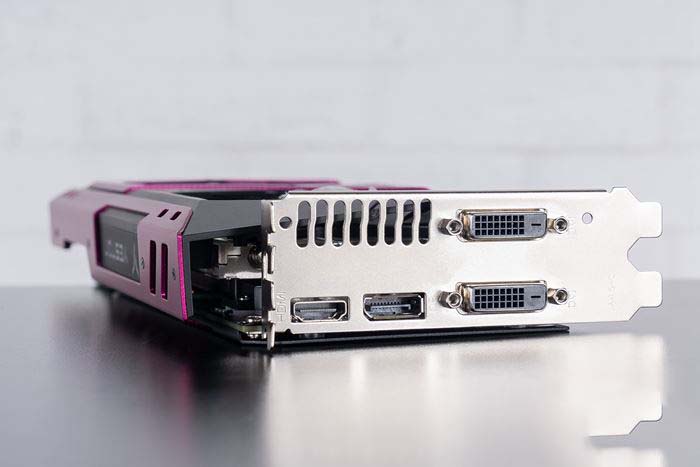 接口側面可以看到顯示輸出接口分別是DisplayPort×1、HDMI×1,DVI×2,相當的齊全。厚度方面,可以看到盈通RX580 2048SP游戲高手OC顯卡整體約為2槽的厚度。