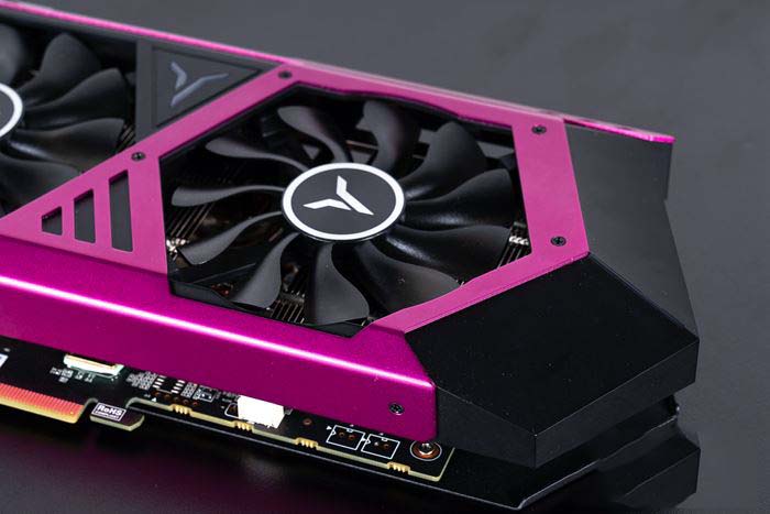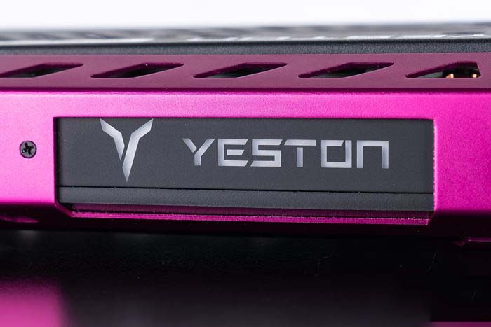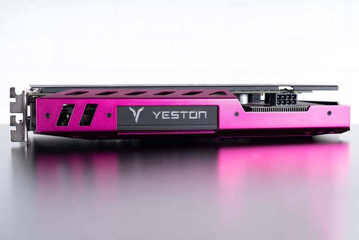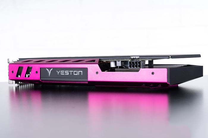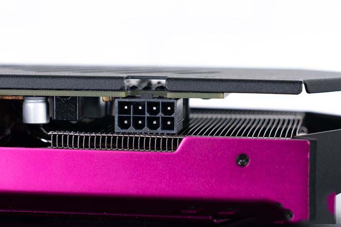 顯卡頂部是大面積的紫色,可以看到盈通logo在頂部中間,這個logo通電可以亮起,在頂部右上角可以看到盈通RX580 2048SP游戲高手OC采用單8pin供電接口。