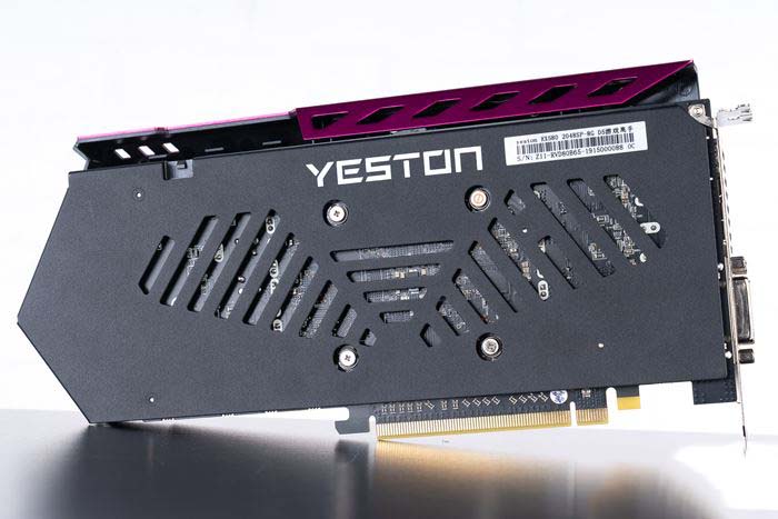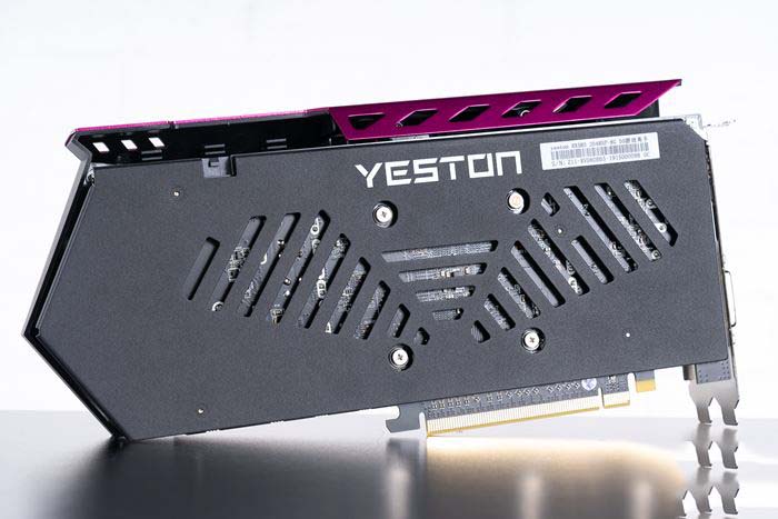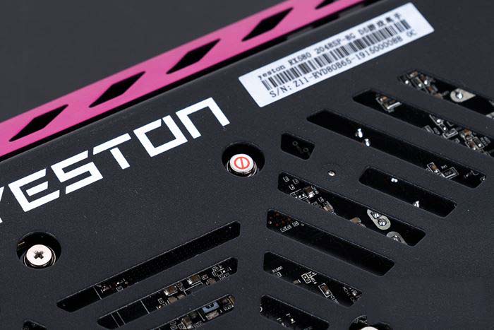 顯卡背面可以看到盈通RX580 2048SP游戲高手OC是具有背板的,該背板全尺寸覆蓋于顯卡背面,材質為金屬,厚度也足,質感相當的好。背板的好處不言而喻,可以全面保護背部元件,讓顯卡更堅固更耐久。該卡背板還做了鏤空設計,不僅美觀,而且可以進一步輔助散熱,此外盈通的logo在背板也有出現,位于背板靠近顯卡頂端的位置。