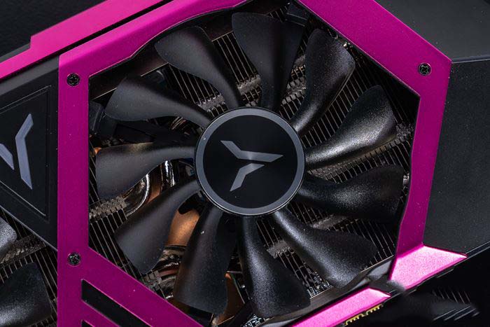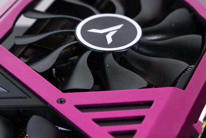 盈通RX580 2048SP游戲高手OC配備了兩個風扇,經測量直徑均為9cm,但是同包裝盒一樣,看到正面你首先注意到的還是它的配色,色彩審美方面該卡非常跳脫,考慮到這個方面太主觀,本篇評測關于色彩方面盡量引述盈通自己的文案,關于顯卡正面,盈通關于該卡的介紹里寫得是“能八塊腹肌拼刺刀,也能逗比沙雕惹風騷”。