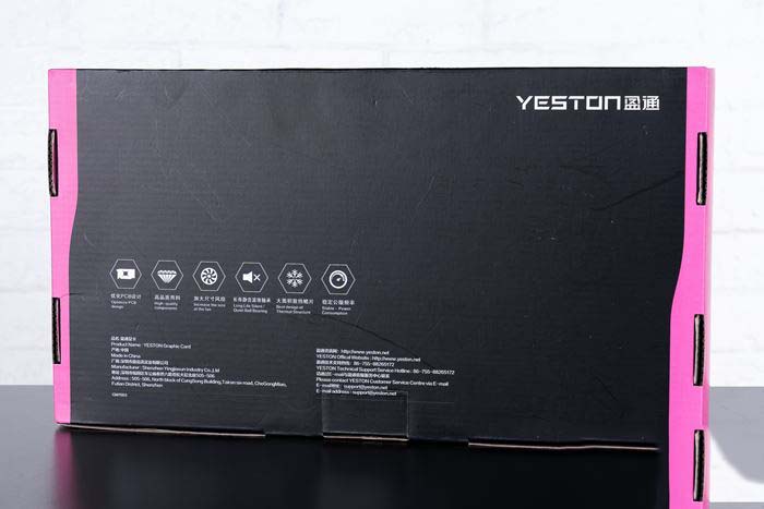盒子背面簡要的描述了該卡的幾個賣點,分別寫得是:優化PCB設計、高品質用料、加大尺寸風扇、長壽靜音滾珠軸承、大面積散熱鰭片、穩定公版頻率。