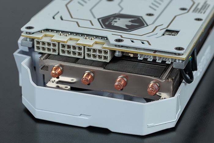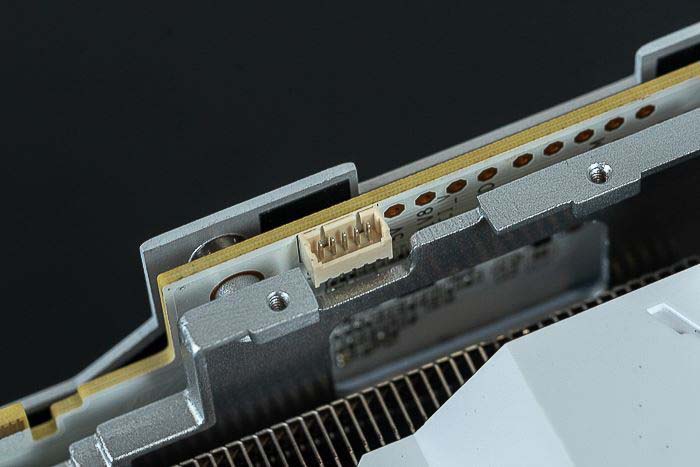 在顯卡末端可以看到4根熱管,并且為這塊顯卡配備了三個8pin外接供電,與PCIe一起為顯卡提供75W+150W*3=525W的供電。在供電右邊也有兩處小的4pin接口,這個也可以為顯卡支架等進行供電。