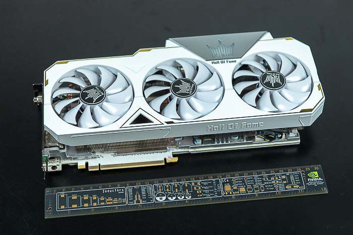 接下來我們看看顯卡本體。作為一張頂級顯卡,影馳RTX 2080 Ti HOF Plus顯卡的體型巨大,尺子測量后可以看到,安裝風冷散熱器的顯卡長度超過了30厘米,這種長度的顯卡在安裝時就需要玩家考慮一下自己的機箱是否能裝下巨大的顯卡了。在整體外觀上,還是采用HOF系列的“家族色”白色,有一些金色點綴,在右上方兩個風扇間有HOF的logo,但是并不顯突兀。整體精致,質感不錯。